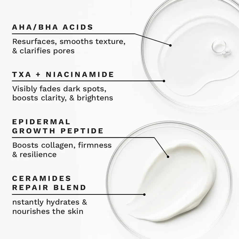 Formulated with clinically proven actives and hydration magnets, these two formulas refine, smooth, plump and hydrate skin for a dewy glow.